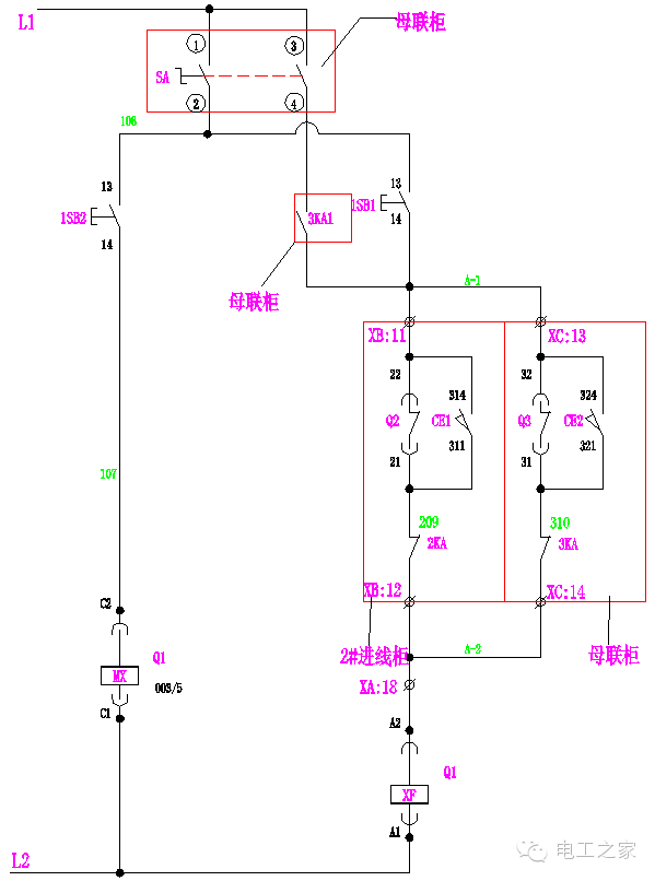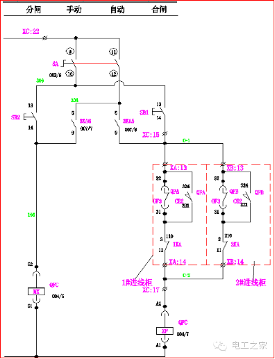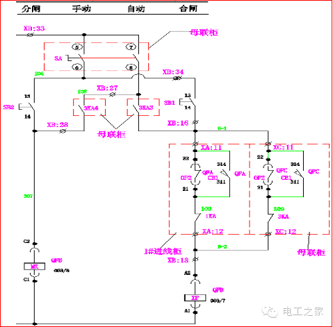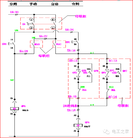 在手動操作中:10,000轉SA的1和2條腿連接在一起。當Q2和Q3閉合時,Q1閉合回路A-2和A-3斷開,其閉合線圈XF不能通電,Q1不能滿足閉合條件。同樣,當Q1、Q2或Q1、Q3同時接通時,Q2或Q3也不能滿足切換條件。使進線柜和母聯(lián)符合“三合一”的邏輯。