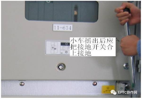 5.將接地開關(guān)的操作手柄插入中間門右下側(cè)的六角孔中,順時針旋轉(zhuǎn)使接地開關(guān)處于關(guān)閉位置。確認接地開關(guān)已經(jīng)關(guān)閉后,打開機柜的下門,以便維護人員可以進入維護和檢修。