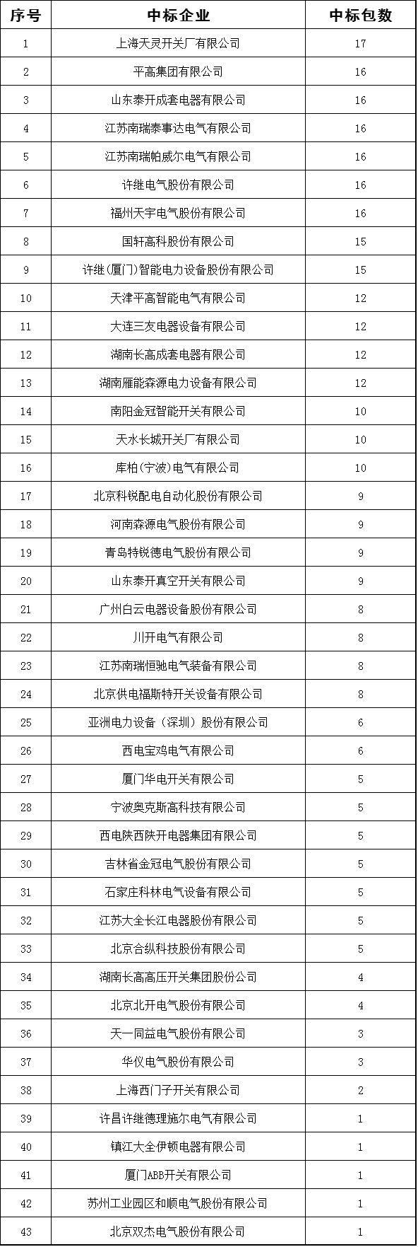 中標(biāo)的還有上海田零開關(guān)廠有限公司、江蘇南瑞泰時代電氣有限公司、庫珀(寧波)電氣有限公司、福州天宇電氣有限公司、天津高萍智能電氣有限公司、郭萱高科有限公司、江蘇大全長江電氣有限公司、廈門華電開關(guān)有限公司、江蘇南瑞帕威爾電氣有限公司、廣州白云電氣設(shè)備有限公司、西電寶雞電氣有限公司、青島特立尼達(dá)電氣有限公司、天同一電氣有限公司、山東泰凱真空開關(guān)有限公司和廈門ABB