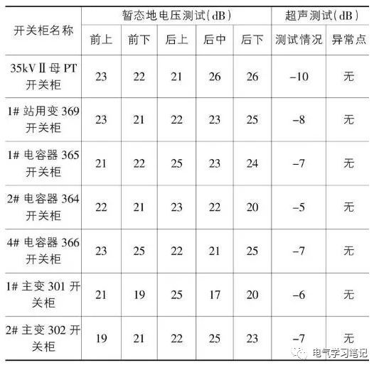 當(dāng)開關(guān)室內(nèi)的背景噪聲值低于20毫伏,測量值高于30毫伏時,表明開關(guān)柜有局部放電,表明嚴(yán)重。為了消除故障,制定了停電修復(fù)缺陷處理方案。2016年5月12日,110kv 變電站35kVⅱ母線及其設(shè)備停電檢修。進(jìn)行交流耐壓試驗(yàn)。發(fā)現(xiàn)35kV母線PT開關(guān)柜上母線排a相支柱絕緣子有明顯放電現(xiàn)象。35kV母線PT開關(guān)柜頂部母線倉蓋現(xiàn)場打開。人們發(fā)現(xiàn)公共汽車?yán)浔粐?yán)重污染了。同時發(fā)現(xiàn)母線a相支柱絕緣子有表面閃絡(luò)放電痕跡,并伴有燒損現(xiàn)象。之后,徹底清潔母線箱,更換A相支柱絕緣子。然后做交流耐壓,絕緣合格,無異常聲音。送電后運(yùn)行24小時后,再次進(jìn)行局部放電試驗(yàn),此時開關(guān)柜,瞬態(tài)接地電壓和超聲波局部放電數(shù)據(jù)正常(試驗(yàn)數(shù)據(jù)如下表所示),放電缺陷消除。