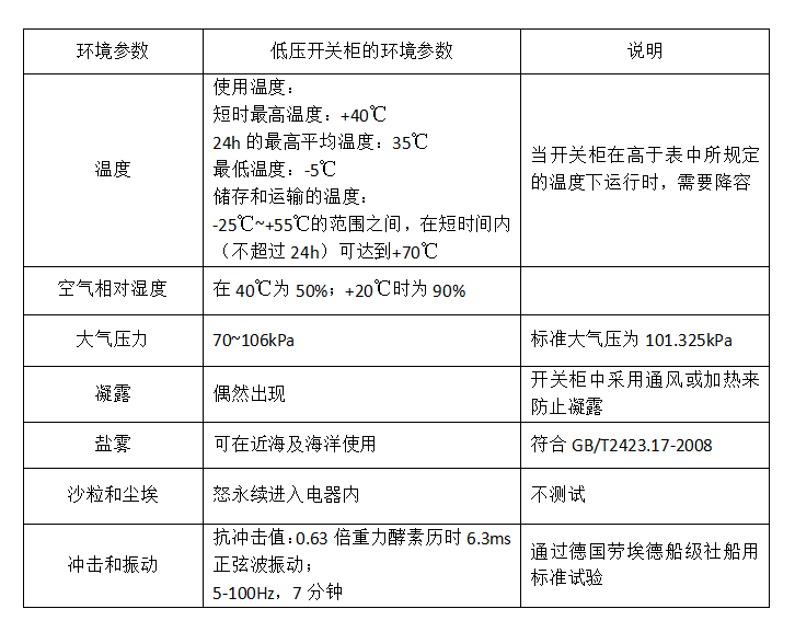 注:表中開關(guān)柜的環(huán)境參數(shù)符合下列標(biāo)準(zhǔn):IEC6.439-1、EN60439、VDE0660第500部分、GB7251.2005。