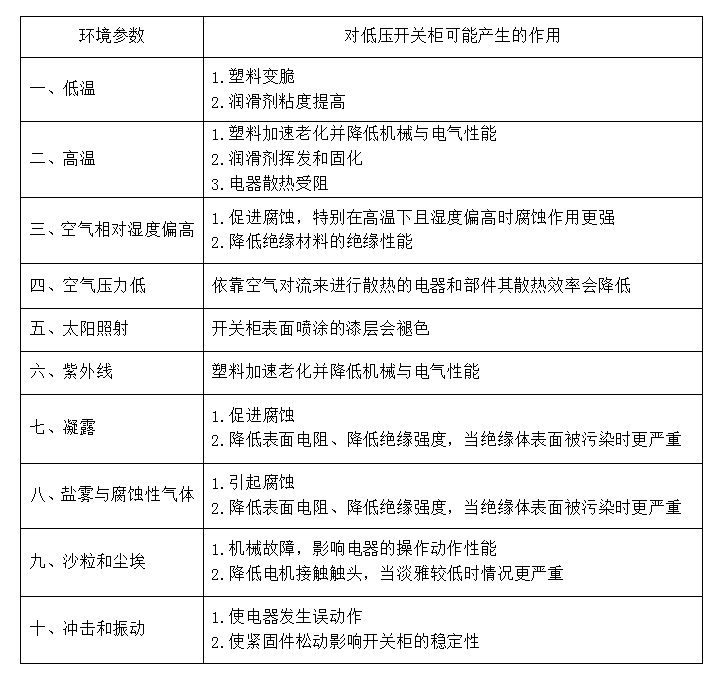 低壓開關(guān)柜在其15-20年的工作壽命期間,環(huán)境對生活的影響不可低估。環(huán)境對低壓開關(guān)柜的可能影響如表1所示。