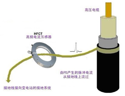 當(dāng)對高壓電纜執(zhí)行局部放電檢測時,高頻變壓器也可以在此模式下使用,如下圖所示: