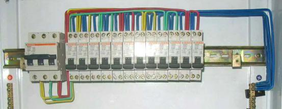 5.連接兩行零線(藍(lán)色)、相A(黃色)、相B(綠色)和相C(紅色)后的照片: