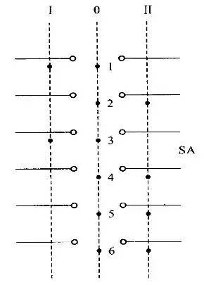 當(dāng)手柄轉(zhuǎn)到不同檔位時,每個觸點(diǎn)的開關(guān)狀態(tài)由黑點(diǎn)表示,黑點(diǎn)表示觸點(diǎn)閉合,無黑點(diǎn)表示觸點(diǎn)斷開。