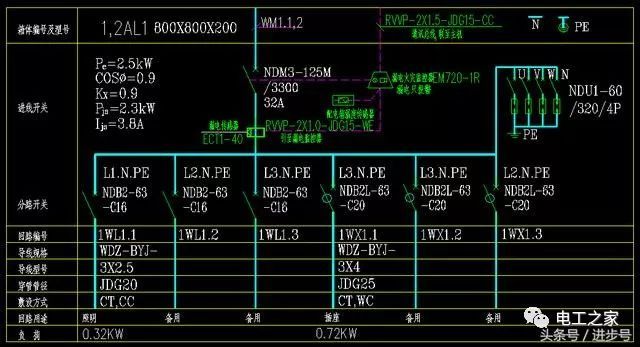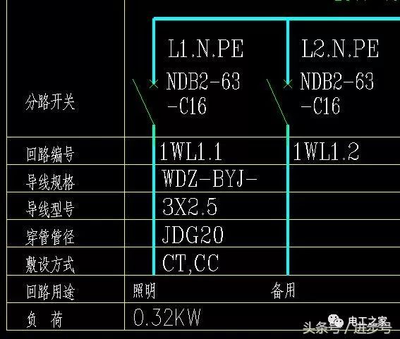 L1。并聯(lián)開關(guān)上方的N.PE指的是采用一路帶電導(dǎo)線,即三項中的一項,加上零線和地線,形成一個1WL1.1回路,電源電壓為220伏。導(dǎo)線規(guī)格WDZ-BYJ-3X2.JDG20-CT,CC指低煙無鹵阻燃交聯(lián)聚乙烯絕緣(銅芯)導(dǎo)線,3根2.5平方毫米,直徑20毫米的金屬管,橋架及沿屋面暗敷設(shè)。同時,標(biāo)記該回路用于照明和備用。照明負(fù)載為0.32千瓦,相對較小。
