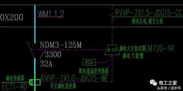 圖紙這一部分的信息量也相對較大,所以要盡量詳細(xì)。WM1.1和WM 2表是從1.1回路和1.2回路中得出的,上層的總照明配電箱。帶有附加電流32A的NDM125M/3300 32A斷路器;ECT40是一個電子傳感器。確切的名稱應(yīng)該是剩余電流互感器。根據(jù)以前的電流計算,選擇63A或100A的剩余電流互感器就足夠了。工作原理是檢測器火線和零線(零線)的電流矢量之和,以及電流損耗(即泄漏)的計算。配電箱溫度傳感器,是配電箱箱溫的檢測器,溫度檢測和泄漏檢測屬于電氣火災(zāi)監(jiān)控系統(tǒng)的標(biāo)準(zhǔn)箱。EM720-1R是一種電氣火災(zāi)探測器,用于向電氣火災(zāi)監(jiān)控設(shè)備(主機)傳輸泄漏信息、溫度信息和報警信息。使用rvp-2X1.jdg 1cc,即2X1.5平方毫米屏蔽軟線,天花板中隱藏一根直徑為15毫米的金屬管。
