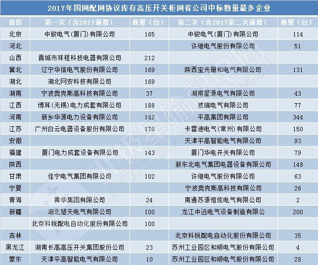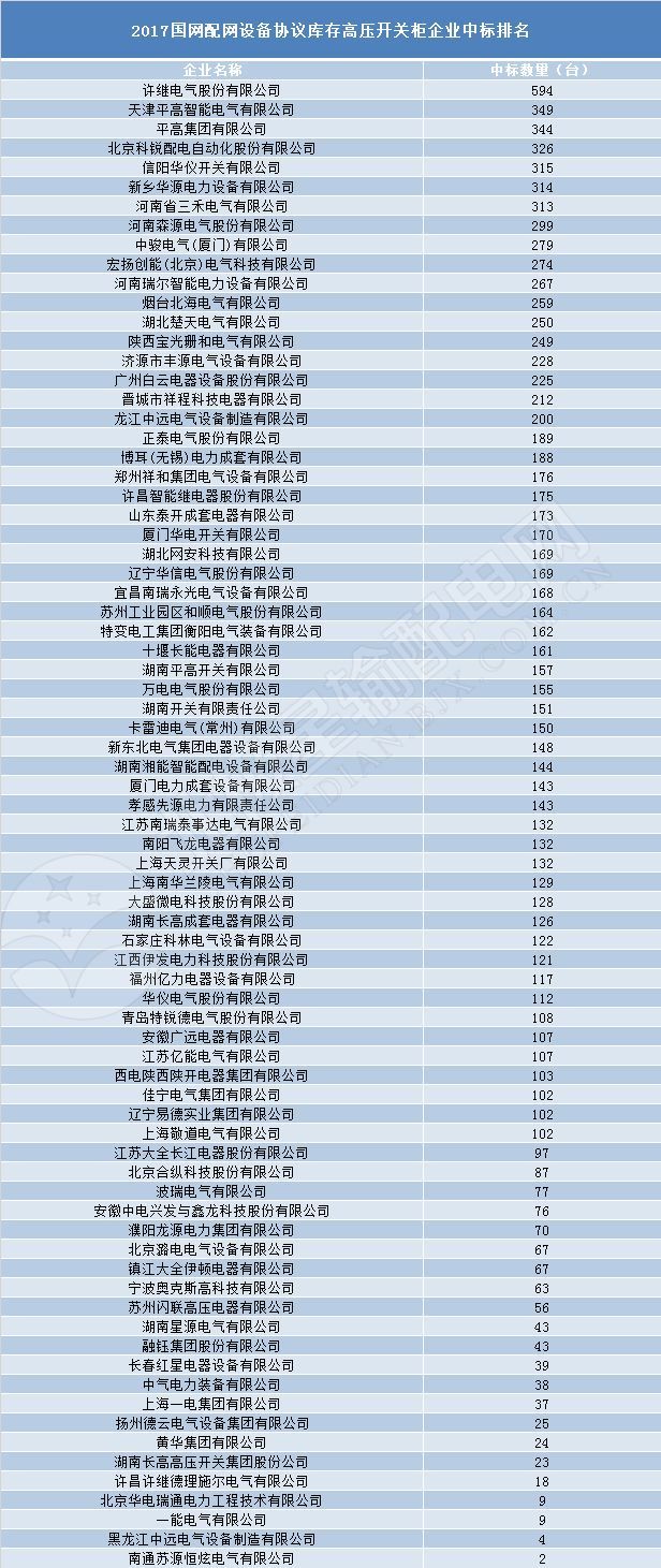 說(shuō)到投標(biāo)情況,怎么會(huì)沒(méi)有中標(biāo)的情況呢?接下來(lái),邊肖將讓大家了解2017年全國(guó)配電網(wǎng)設(shè)備協(xié)議庫(kù)存開(kāi)關(guān)柜設(shè)備的中標(biāo)情況。