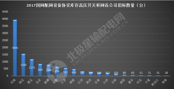 接下來(lái),邊肖將帶您了解2017年配電網(wǎng)設(shè)備協(xié)議庫(kù)存高壓開(kāi)關(guān)柜設(shè)備的國(guó)家電網(wǎng)省級(jí)公司的投標(biāo)情況。具體投標(biāo)數(shù)量見(jiàn)下圖。從圖中可以看出,河南的招標(biāo)數(shù)量最多,有3945個(gè)單位。河南、湖北、河北北部、北京和新疆是招標(biāo)數(shù)量最多的5個(gè)省,分別為3945、1560、1173、849和789個(gè)單位,占72.06%。此外,天津、山東、四川、重慶、上海、浙江、西藏和遼寧省四次未參加配網(wǎng)設(shè)備協(xié)議高儲(chǔ)存壓力開(kāi)關(guān)柜設(shè)備的投標(biāo)。