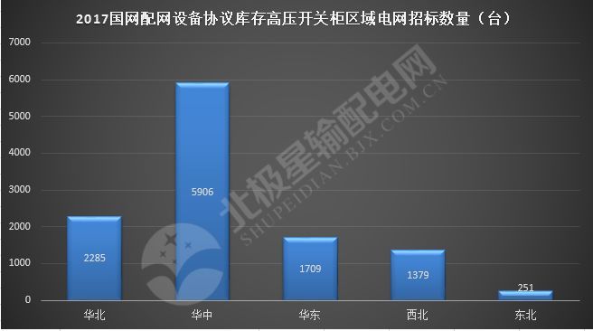 近年來(lái),隨著電力發(fā)展步伐的加快,中國(guó)電網(wǎng)也發(fā)展迅速。電網(wǎng)系統(tǒng)運(yùn)行電壓水平不斷提高,網(wǎng)絡(luò)規(guī)模不斷擴(kuò)大。中國(guó)電網(wǎng)運(yùn)行區(qū)域已形成覆蓋不同省份的五大區(qū)域電網(wǎng),即東北電網(wǎng)、華北電網(wǎng)、華中電網(wǎng)、華東電網(wǎng)和西北電網(wǎng)。2017年,參與國(guó)家電網(wǎng)配電網(wǎng)設(shè)備協(xié)議存儲(chǔ)欄斷路器招標(biāo)的五個(gè)地區(qū)電網(wǎng)分布均勻。從下圖可以看出,華中電網(wǎng)的投標(biāo)數(shù)量遙遙領(lǐng)先,有5906臺(tái),占51.18%;華北、華東和西北電網(wǎng)的招標(biāo)數(shù)量相對(duì)統(tǒng)一,從1000臺(tái)到2000臺(tái)不等。東北電網(wǎng)是最低的,只有251臺(tái)被邀請(qǐng)投標(biāo)。